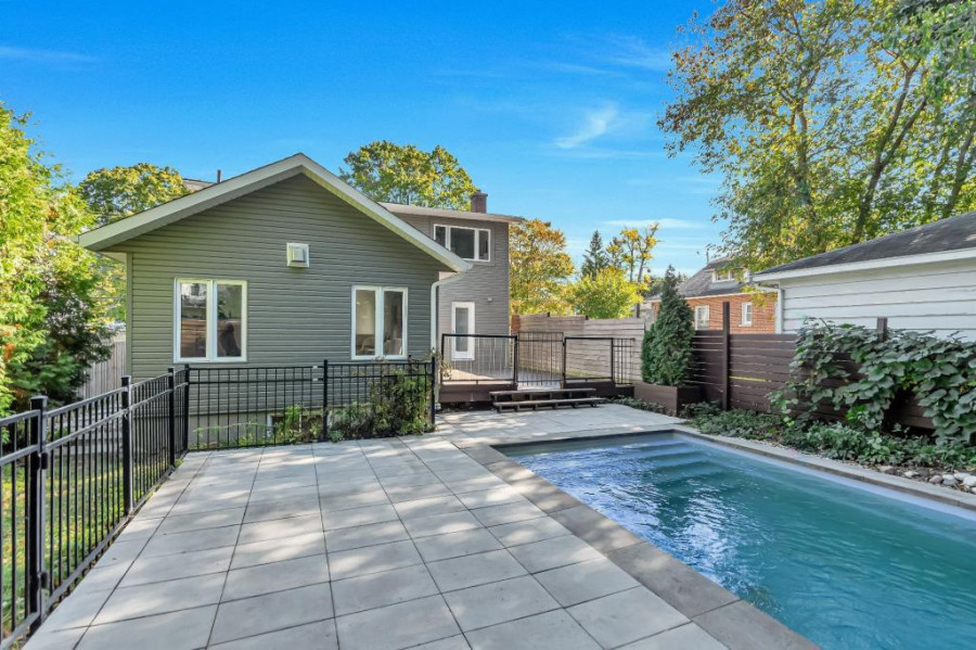 后院为度假胜地,拥有地上泳池及休闲区,围栏维护良好,私密性强,是夏日聚会与日常放松的理想场所。院落设计精致,打造出难忘的家庭娱乐空间。