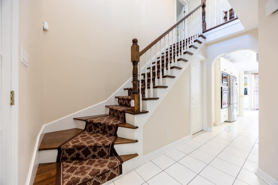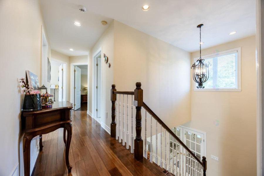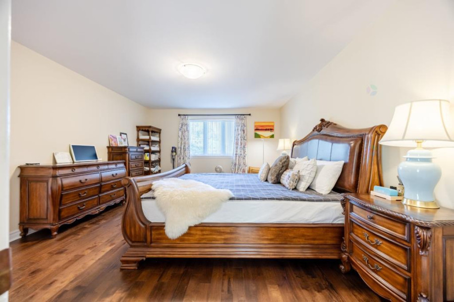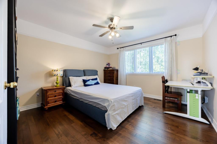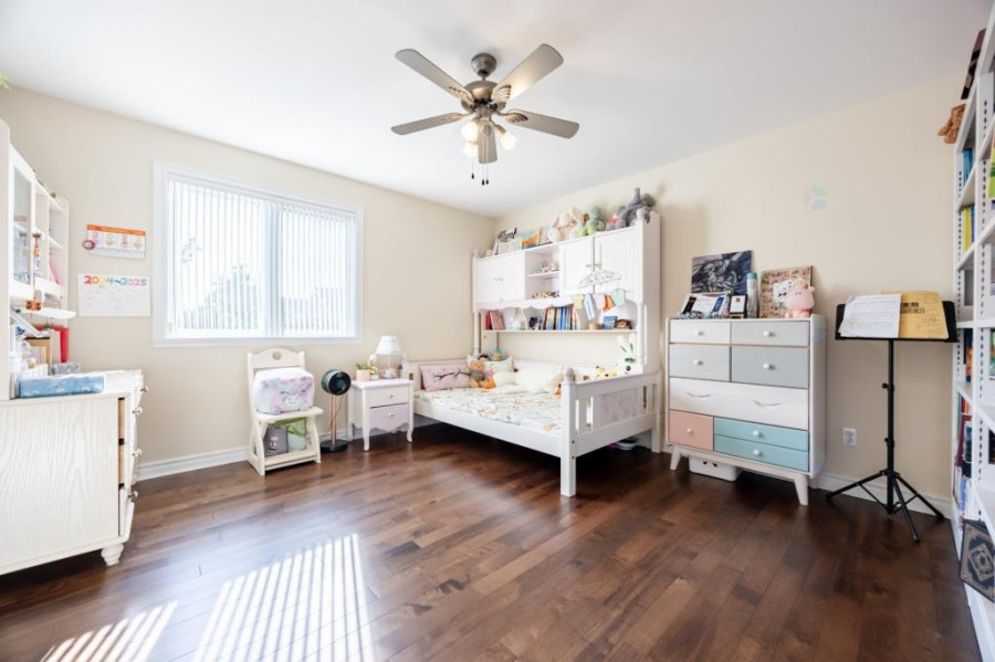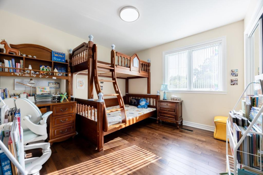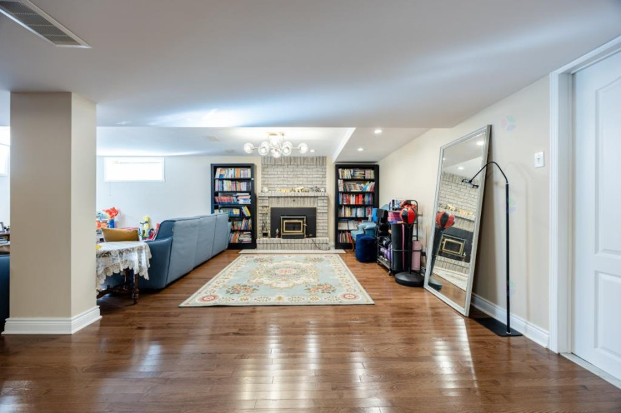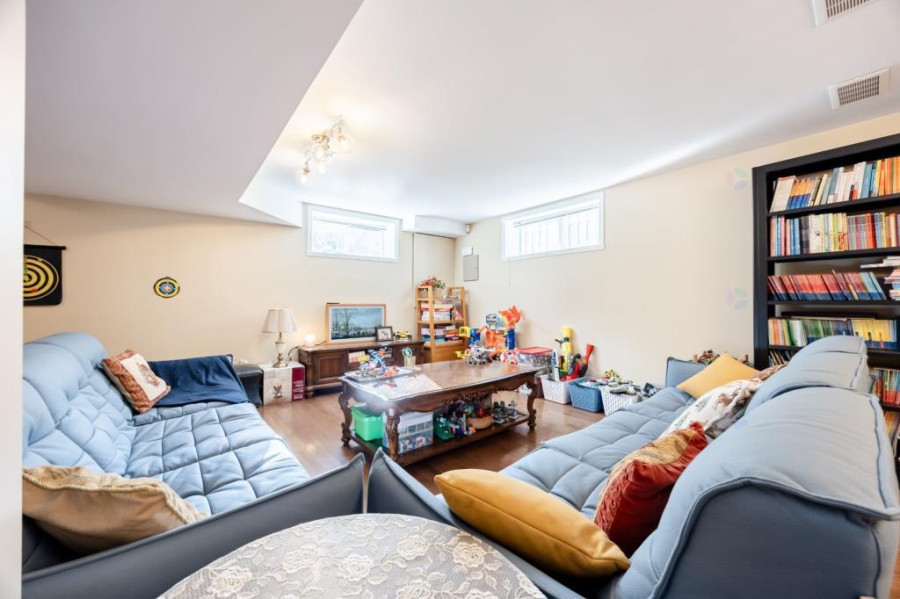 二层设四间卧室,包含一间宽敞主卧室,空间充裕采光佳。全层铺设实木地板,配备两间全套浴室,满足家庭日常生活需求,布局合理舒适。地下室为全装修空间,设有家庭娱乐区、游戏室、办公室及化妆间,层高7英尺,空间灵活多变,可作为家庭影院、工作区或额外客房使用。