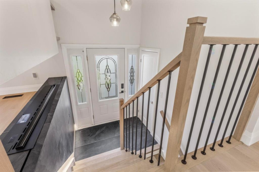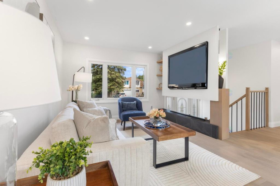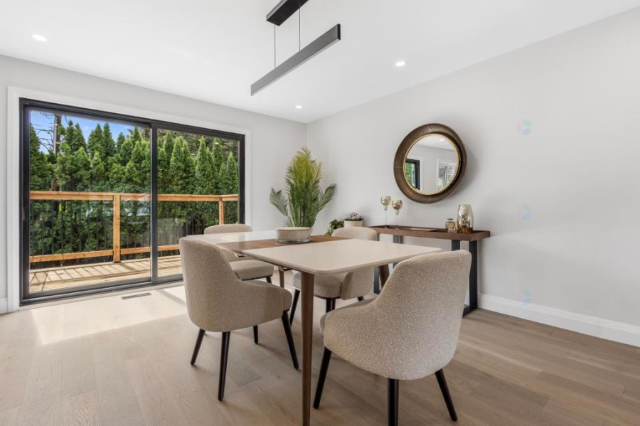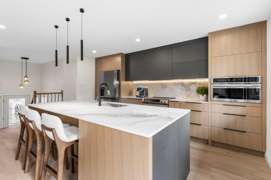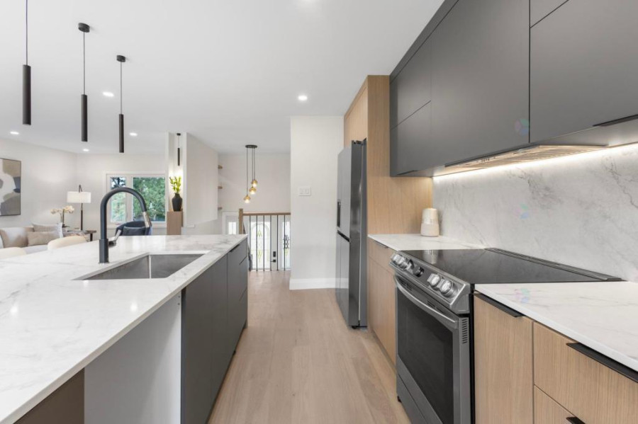主层采用开放式布局,宽板白橡木地板贯穿全屋,客厅配备时尚电壁炉,采光充沛。厨房配备超大型中岛、石英石台面及定制橱柜,与用餐区流畅衔接,推拉门直通庭院。