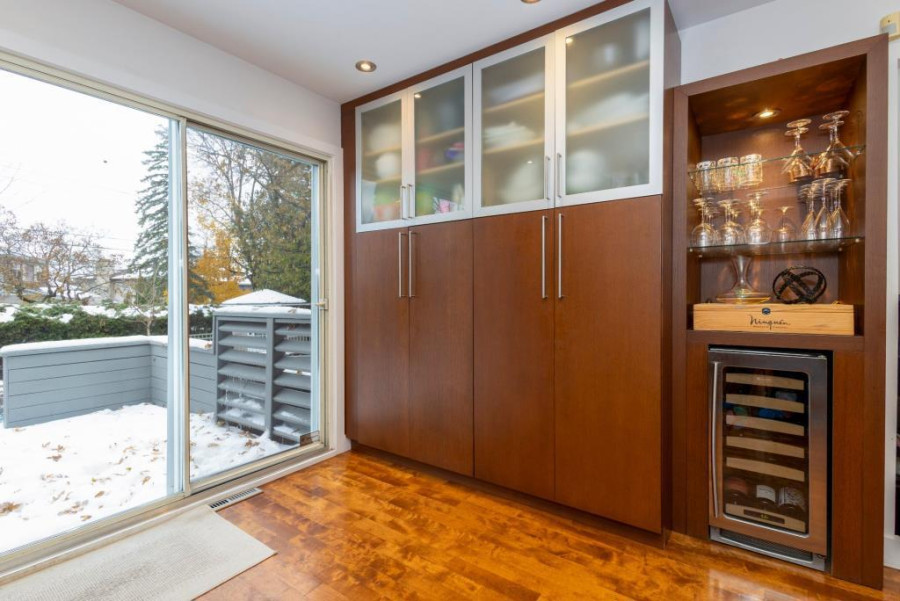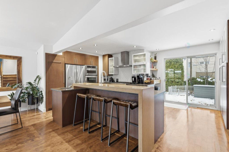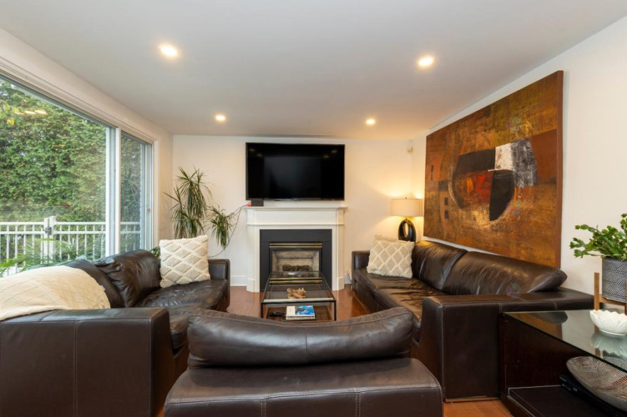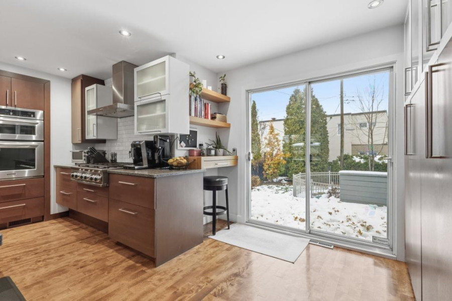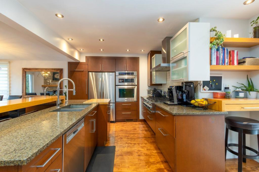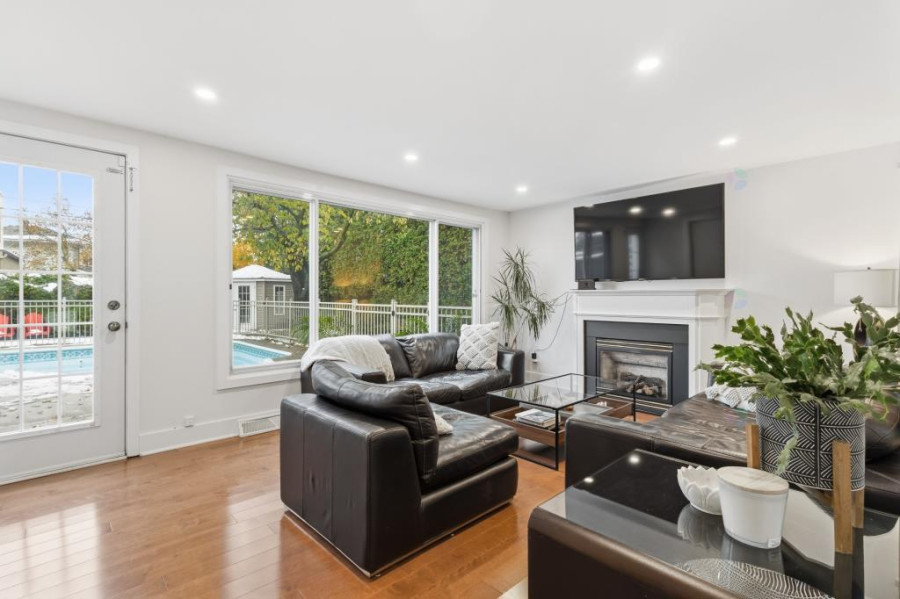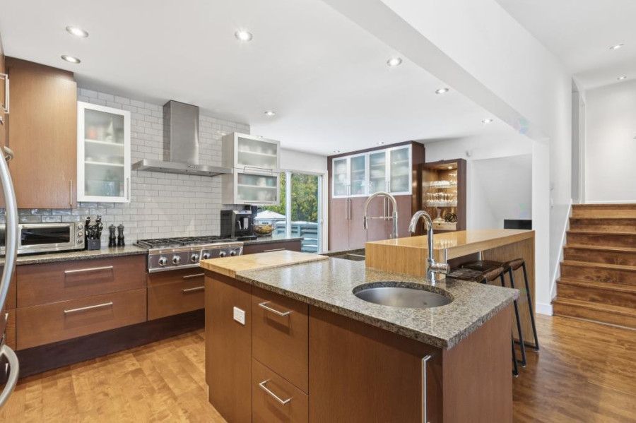 主层采用错层布局,实木地板贯穿厨房与家庭厅,空间开阔明亮。厨房全新升级,与用餐区流畅衔接,推拉门直通后院,燃气壁炉营造温馨氛围。