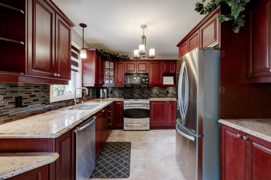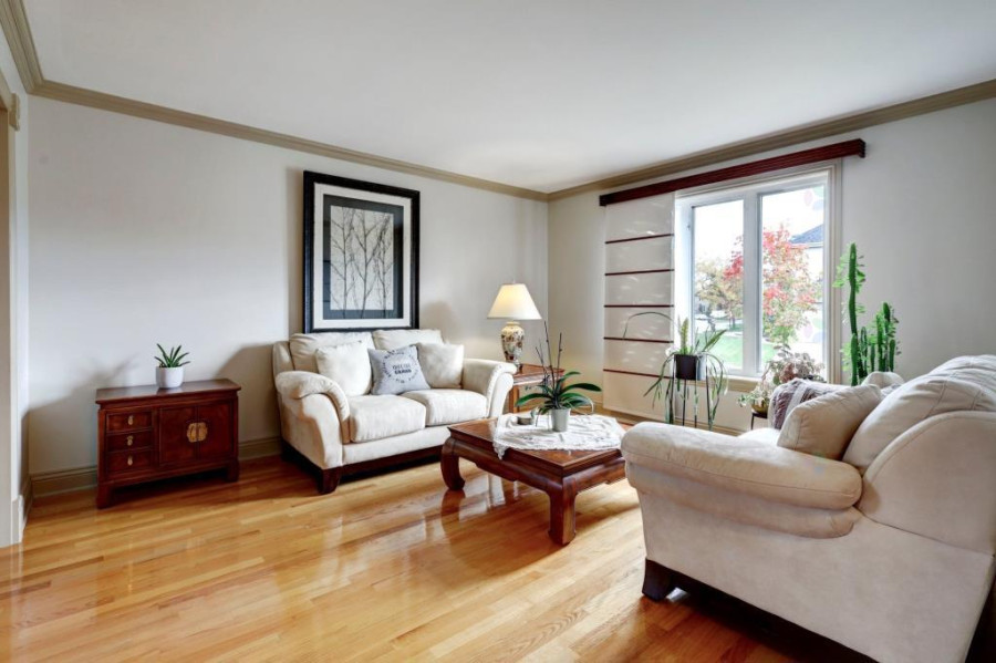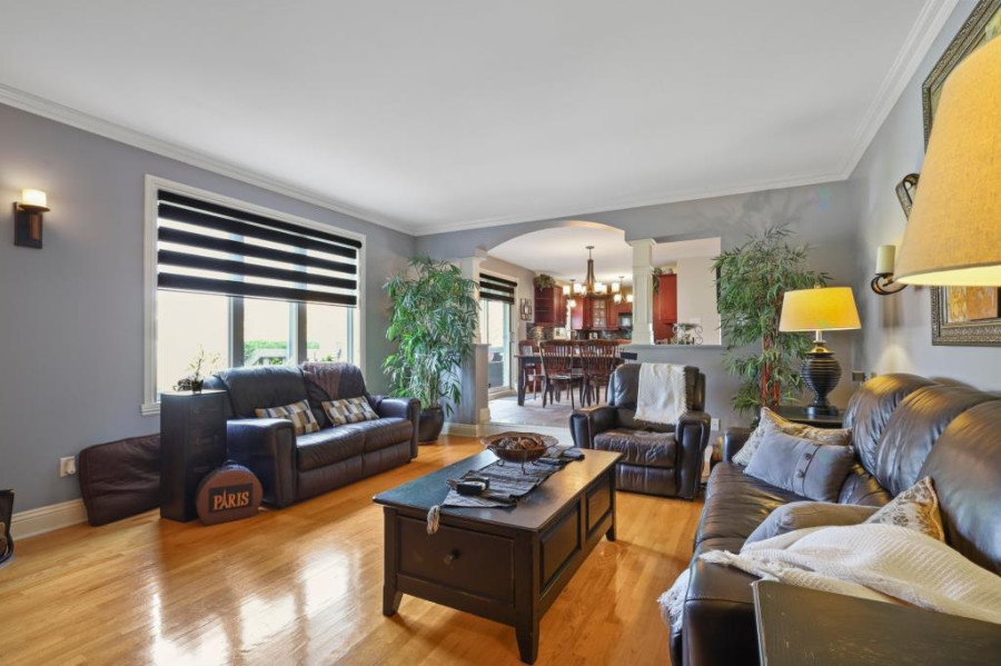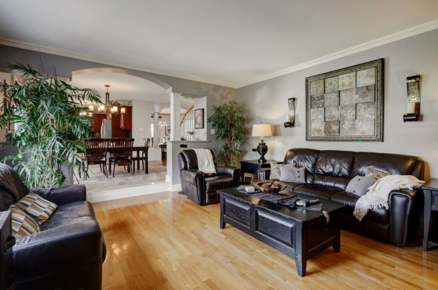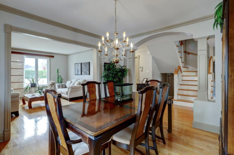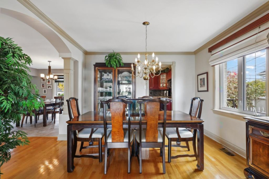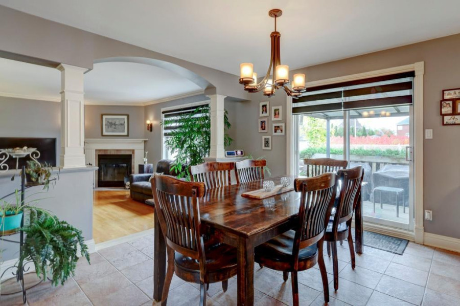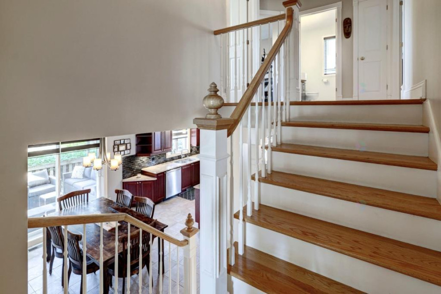 主层布局宽敞通透,设有正式客厅与餐厅,木地板铺设营造温暖质感。厨房采用花岗岩台面与充足橱柜配置,连接宽敞Dinette区域,并通过露台门直通后院。家庭厅设有燃木壁炉,是日常家庭互动与聚会的核心空间。整体动线流畅,兼具功能性与生活氛围。