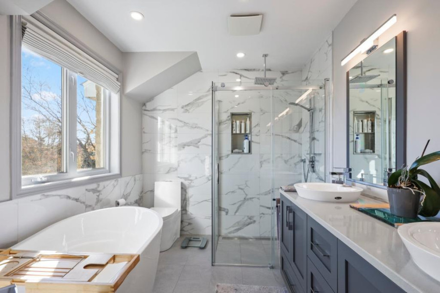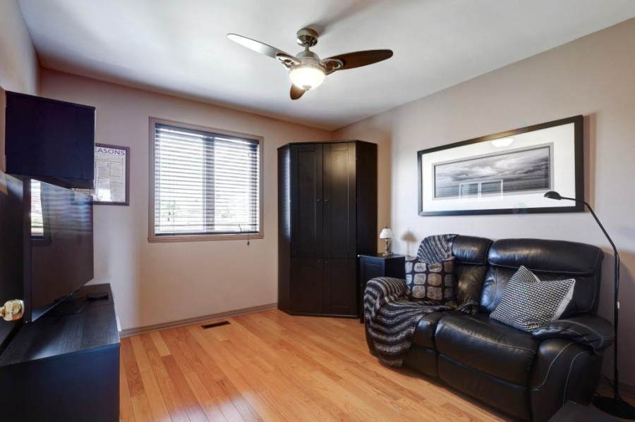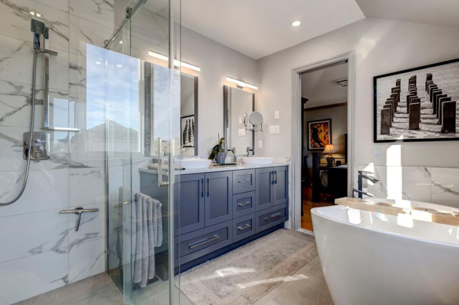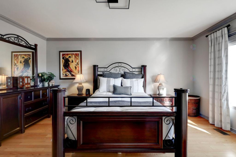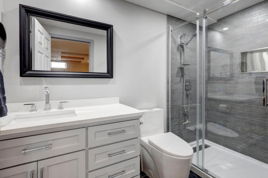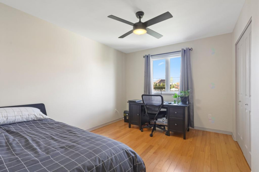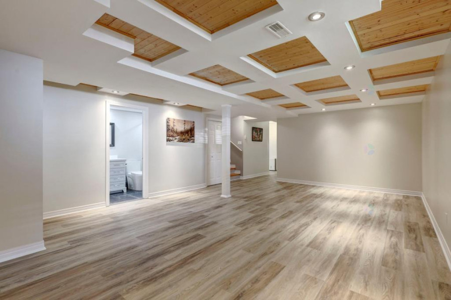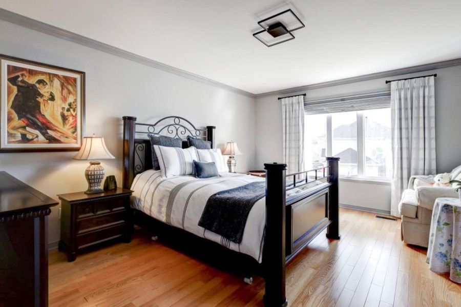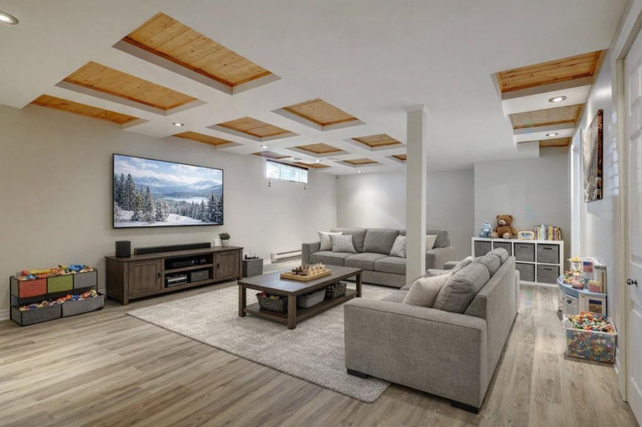 二楼设有四间卧室,其中一间位于独立分层区域,私密性更佳。主卧套房空间开阔,配备豪华套内浴室,设有独立浴缸与玻璃淋浴间,整体设计现代大气。其余卧室比例均衡,适合多孩家庭或灵活规划为书房使用。地下室为已完成空间,设有大型娱乐活动区、两间卧室及完整浴室,可作为客房、家庭娱乐区或居家办公空间使用,功能配置完整。