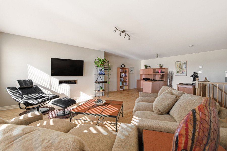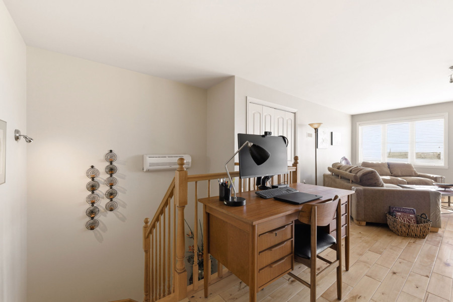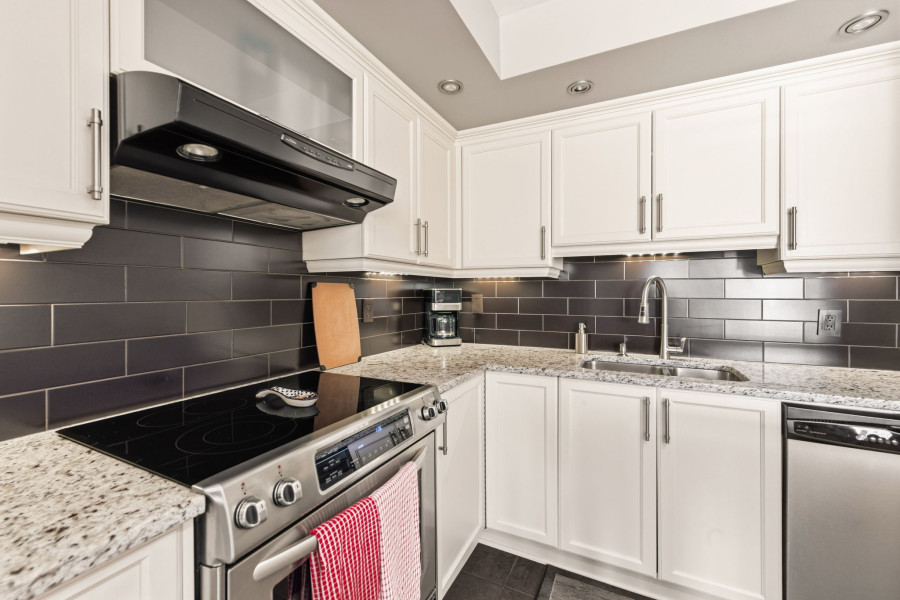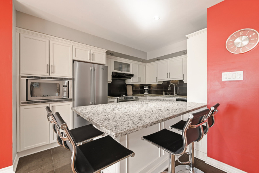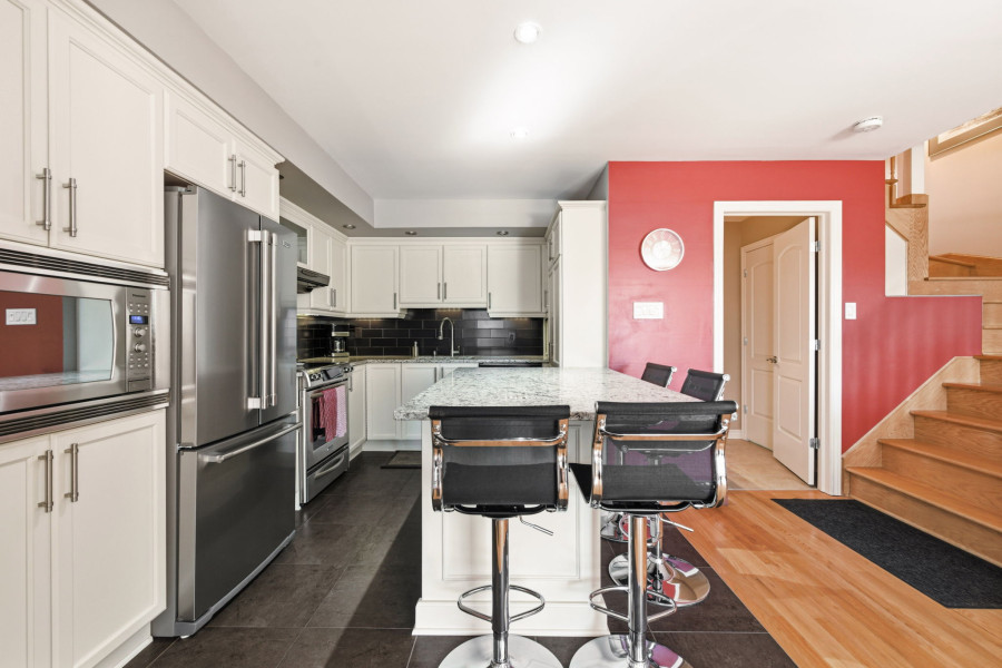 This 3-level property offers a renovated kitchen with an oversized kitchen island , large windows, two spacious bedrooms, a