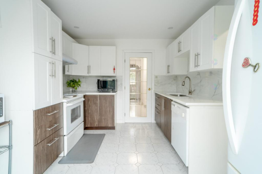 主层布局简洁实用,客厅与餐厅连通,空间开阔明亮,适合日常家庭生活与接待访客。厨房为近年更新设计,整体色调清爽,储物空间充足,并可直接通往后院阳台区域,日常烹饪与家庭用餐更加便利。主层同时设有一间客用卫生间,提升生活使用的便利性。