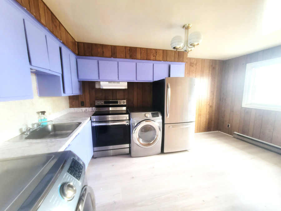 厨房带餐桌区。提供灶台,冰箱,洗衣机,干衣机,AS IS.